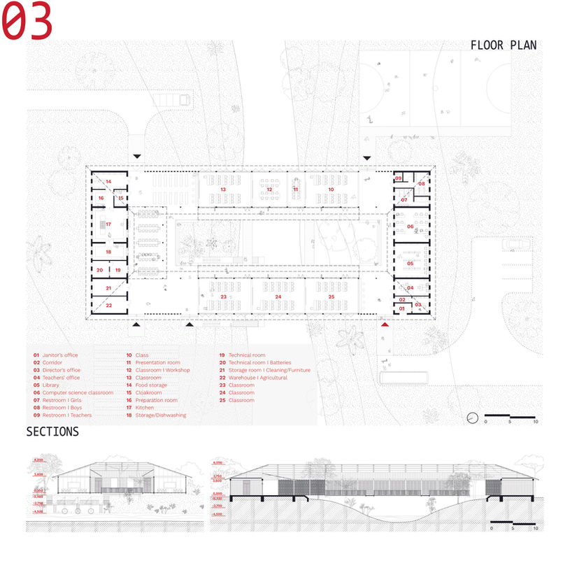 The site’s geographic and climatic conditions strongly influenced the overall concept of the school, which respects the natural barrier and local climate while emphasizing the importance of community connection and access to education.